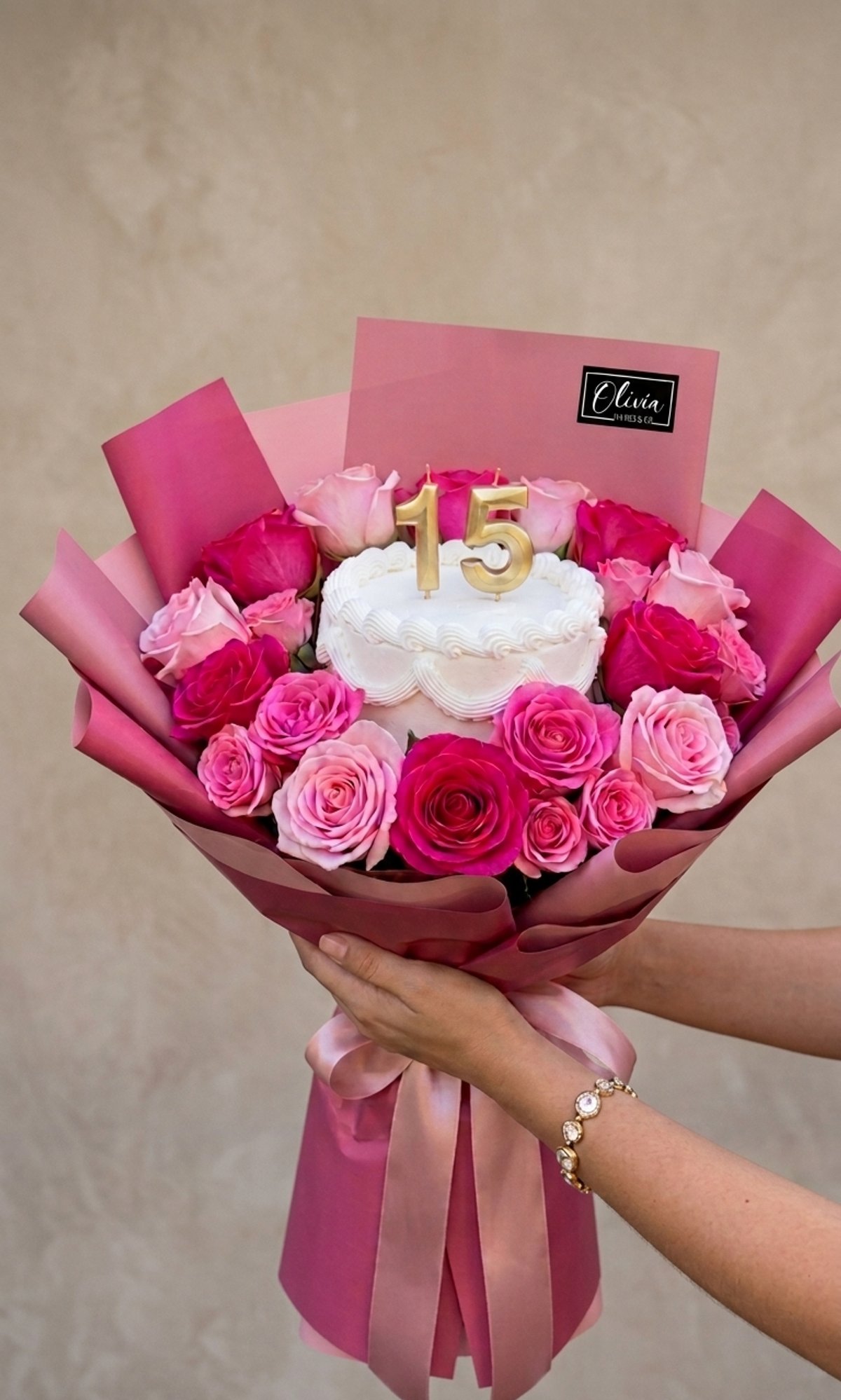 Ramo con 20 rosas + Una mini cake estándar de 500 gr.